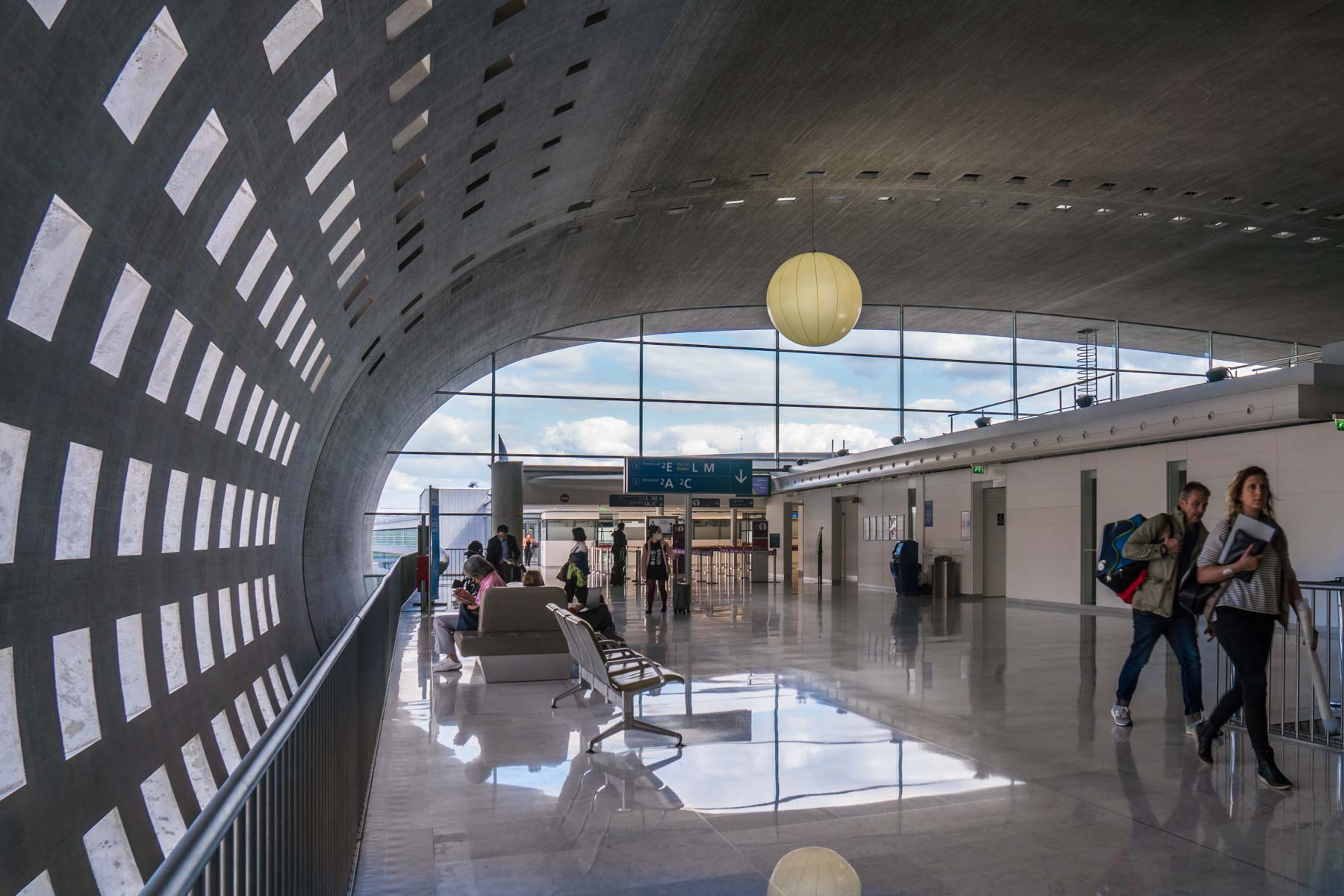 Air France avgångshall på Charles de Gaulle flygplatsen. Hallen är byggd som ett fribärande betongskal.